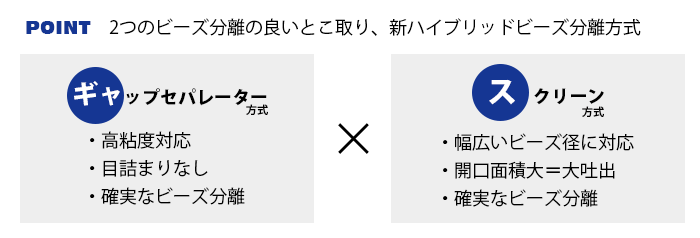 ビーズ偏りによる発熱にお困りの方、圧力上昇により流量を上げられない方、大量生産をしたい方などへおススメ!ギャップセパレーター式・スクリーン式のビーズ分離の良い部分を兼ねそろえたハイブリッドビーズ分離式のビーズミルです。