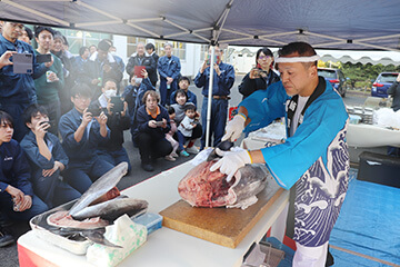 2025年は草加工場に出張マグロ解体ショーがやってきました。軽快な音楽と共に目の前でどんどんマグロが解体されていきます。解体されたマグロはシャリに乗せてお寿司で提供。3種類のお醤油とワサビでおいしく頂きました。分厚いマグロはトロトロ~で最高でした!